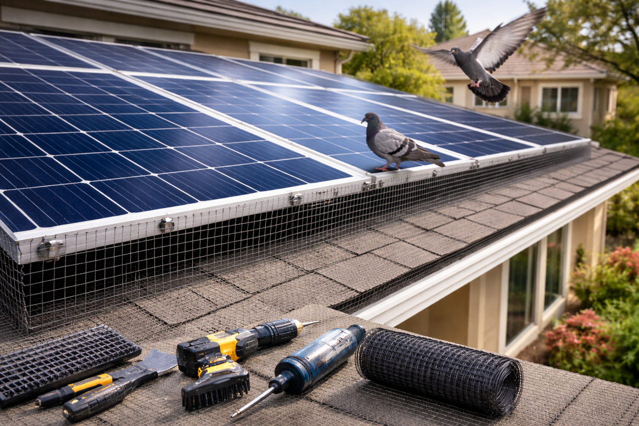 Bird proofing creates a physical barrier that prevents birds from accessing the space beneath your panels. The most common methods include mesh systems, bird spikes, and deterrent strips. Each approach has its place, but not all solutions work equally well for solar panel applications.